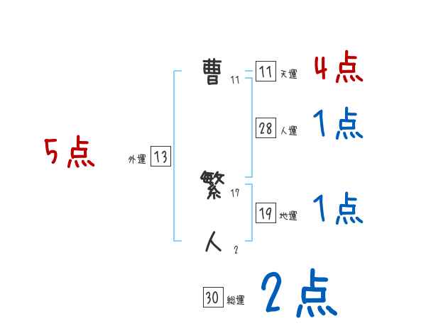 天運![]() | 曹繁人さんの天運は11画の4つ星!着実に富や地位を得る幸運な人生。 家系が持つ宿命的な運勢を表します。祖先から受け継いだ苗字ですので自分の力が及びません。家柄を象徴します。 |