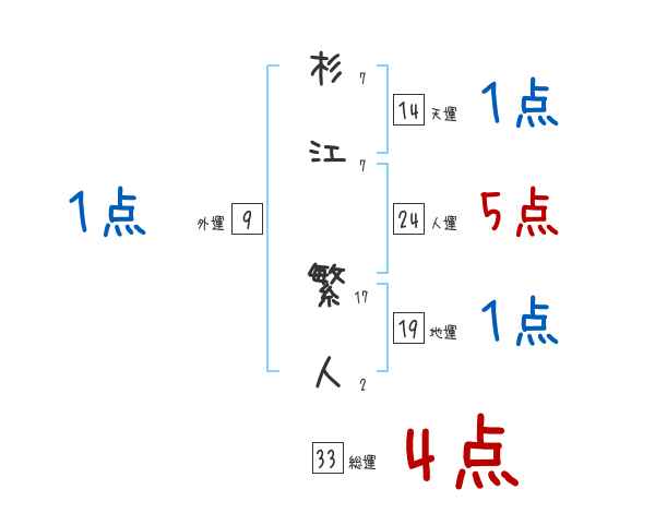 総運![]() | 杉江繁人さんの総運は33画の4つ星!権力志向でプライドが高い。勇気があり運を切り開き成功する。 あなたの人生を表す1番重要な運勢です。生涯を通じて影響する総合運となり、主に50歳以降の晩年期に影響を及ぼします。 |