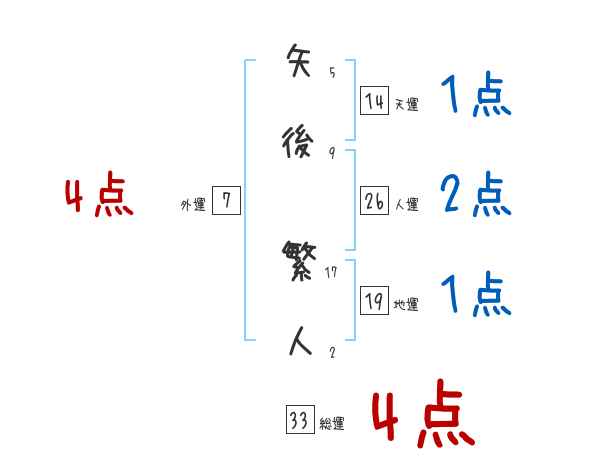 天運![]() | 矢後繁人さんの天運は14画の1つ星!人に対して優しいがストレスを溜め込みがち。人間関係のトラブルを避けるよう気をつけましょう。 家系が持つ宿命的な運勢を表します。祖先から受け継いだ苗字ですので自分の力が及びません。家柄を象徴します。 |