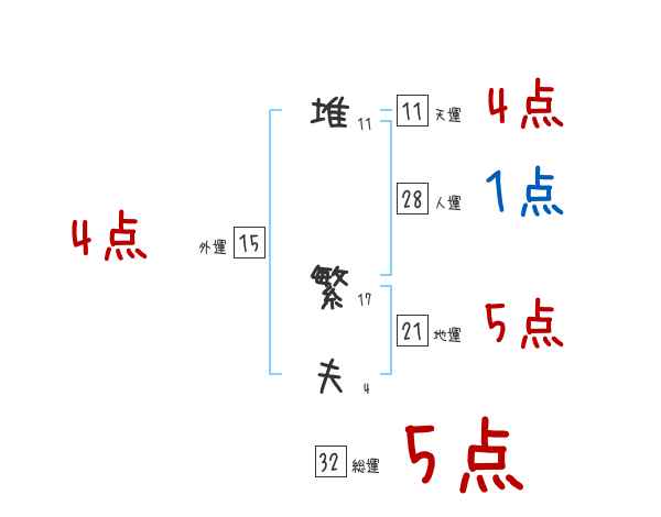 天運![]() | 堆繁夫さんの天運は11画の4つ星!着実に富や地位を得る幸運な人生。 家系が持つ宿命的な運勢を表します。祖先から受け継いだ苗字ですので自分の力が及びません。家柄を象徴します。 |