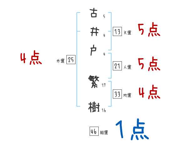 総運![]() | 古井戸繁樹さんの総運は46画の1つ星!迷走することが多く苦労するかも。目先のことにとらわれないように。 あなたの人生を表す1番重要な運勢です。生涯を通じて影響する総合運となり、主に50歳以降の晩年期に影響を及ぼします。 |