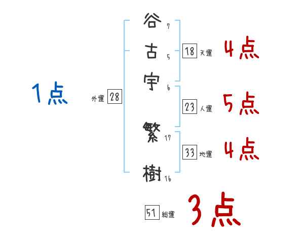 天運![]() | 谷古宇繁樹さんの天運は18画の4つ星!情熱的で剛気。忍耐力があり信頼される。 家系が持つ宿命的な運勢を表します。祖先から受け継いだ苗字ですので自分の力が及びません。家柄を象徴します。 |