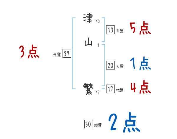天運![]() | 津山繁さんの天運は13画の5つ星!才能に恵まれ人気がある。名声を手に入れる。円満な人生。 家系が持つ宿命的な運勢を表します。祖先から受け継いだ苗字ですので自分の力が及びません。家柄を象徴します。 |