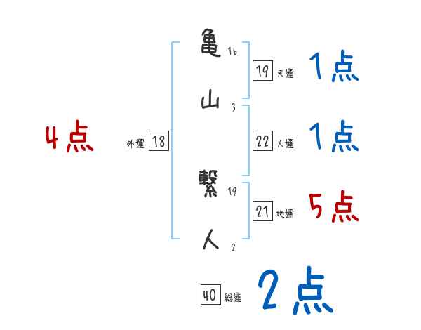 天運![]() | 亀山繋人さんの天運は19画の1つ星!優れた才能を持ちますが、協調性が足りないことも。周りの人と協力する事を意識しましょう。 家系が持つ宿命的な運勢を表します。祖先から受け継いだ苗字ですので自分の力が及びません。家柄を象徴します。 |