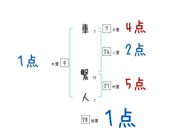総運![]() | 車繋人さんの総運は28画の1つ星!家庭環境に注意。スポーツで活躍できる能力があるかも。 あなたの人生を表す1番重要な運勢です。生涯を通じて影響する総合運となり、主に50歳以降の晩年期に影響を及ぼします。 |