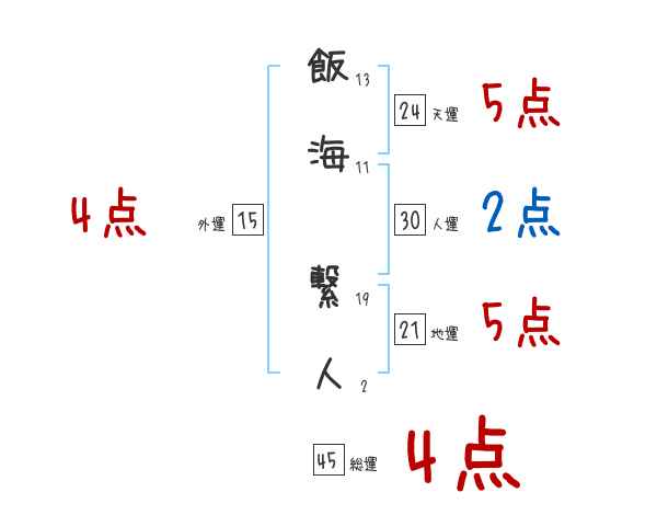 外運![]() | 飯海繋人さんの外運は15画の4つ星!人徳があり出世する。順調に物事を進め円満な人生。 生活面を象徴する運勢です。外部から受ける影響力を表し、結婚運、家庭運や職場、環境への順応性を表します。 |