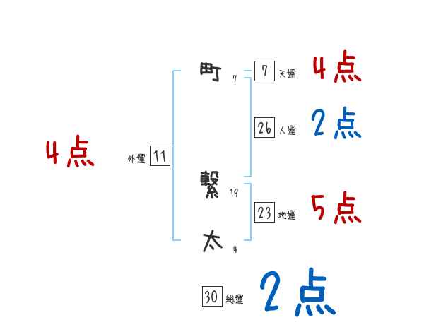 天運![]() | 町繋太さんの天運は7画の4つ星!強い意志や信念を持ち独立心が強い。自立する。 家系が持つ宿命的な運勢を表します。祖先から受け継いだ苗字ですので自分の力が及びません。家柄を象徴します。 |