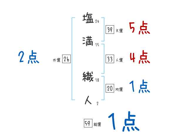 天運![]() | 塩満織人さんの天運は39画の5つ星!社交性に優れ人望が厚い。人の上に立ち成功する。 家系が持つ宿命的な運勢を表します。祖先から受け継いだ苗字ですので自分の力が及びません。家柄を象徴します。 |