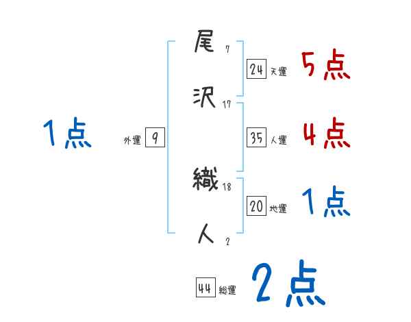 天運![]() | 尾沢織人さんの天運は24画の5つ星!家庭運が良く順調な人生。金運にも恵まれる。 家系が持つ宿命的な運勢を表します。祖先から受け継いだ苗字ですので自分の力が及びません。家柄を象徴します。 |