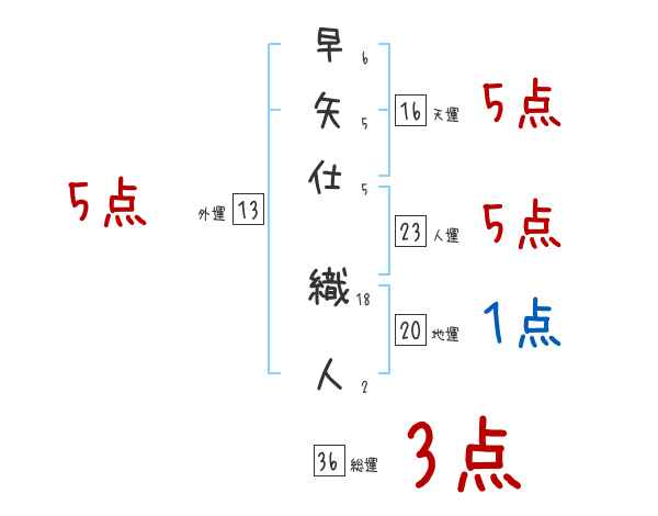 総運![]() | 早矢仕織人さんの総運は36画の3つ星!先見性が豊かです。多少神経質で苦労することも。 あなたの人生を表す1番重要な運勢です。生涯を通じて影響する総合運となり、主に50歳以降の晩年期に影響を及ぼします。 |