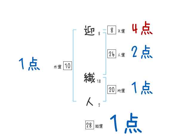 天運![]() | 迎織人さんの天運は8画の4つ星!勤勉家。根気強く努力し成功する。忍耐力がある。 家系が持つ宿命的な運勢を表します。祖先から受け継いだ苗字ですので自分の力が及びません。家柄を象徴します。 |