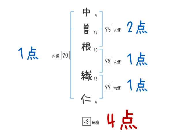 人運![]() | 中曽根織仁さんの人運は28画の1つ星!家庭環境に注意。スポーツで活躍できる能力があるかも。 性格や才能などを表す2番目に重要な運勢です。人間関係や協調性、社会的な成功に影響します。主に20歳から50歳ぐらいまでの中年期の運勢を表します。 |