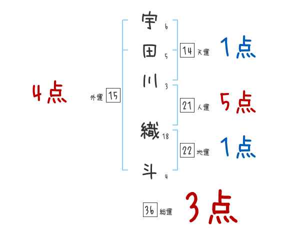 総運![]() | 宇田川織斗さんの総運は36画の3つ星!先見性が豊かです。多少神経質で苦労することも。 あなたの人生を表す1番重要な運勢です。生涯を通じて影響する総合運となり、主に50歳以降の晩年期に影響を及ぼします。 |