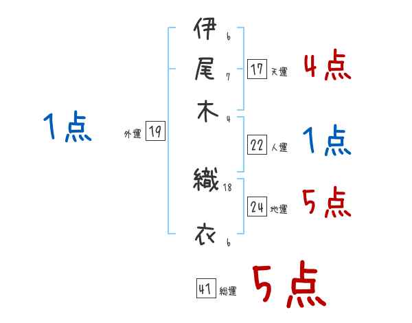 外運![]() | 伊尾木織衣さんの外運は19画の1つ星!優れた才能を持ちますが、協調性が足りないことも。周りの人と協力する事を意識しましょう。 生活面を象徴する運勢です。外部から受ける影響力を表し、結婚運、家庭運や職場、環境への順応性を表します。 |