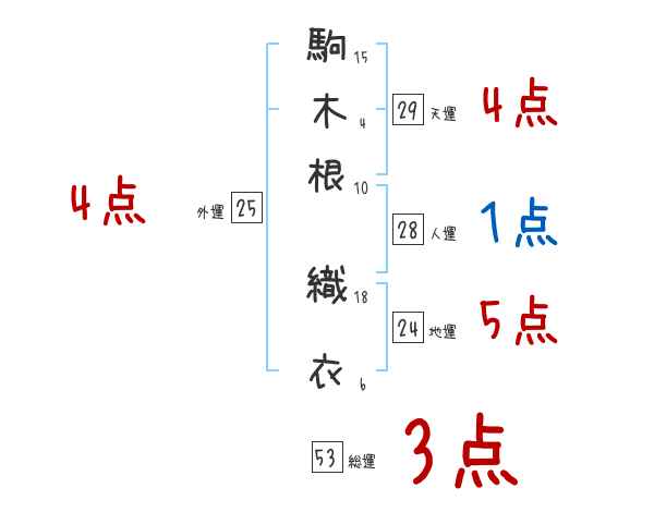 総運![]() | 駒木根織衣さんの総運は53画の3つ星!やや見栄っ張りで虚栄心がある。散財に注意。 あなたの人生を表す1番重要な運勢です。生涯を通じて影響する総合運となり、主に50歳以降の晩年期に影響を及ぼします。 |