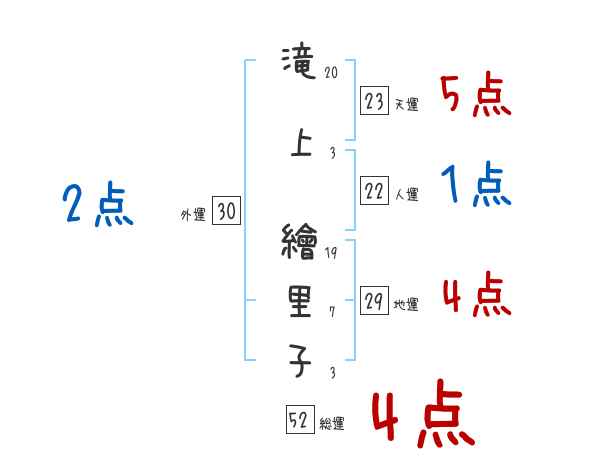 外運![]() | 滝上繪里子さんの外運は30画の2つ星!浮き沈みの激しさに注意しましょう。 生活面を象徴する運勢です。外部から受ける影響力を表し、結婚運、家庭運や職場、環境への順応性を表します。 |