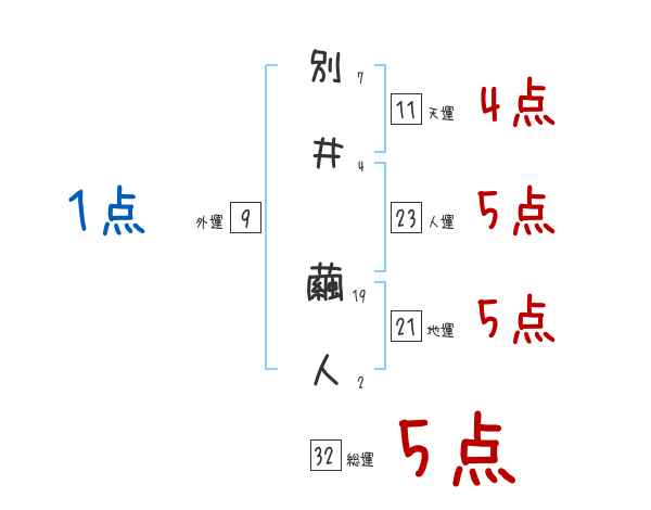 天運![]() | 別井繭人さんの天運は11画の4つ星!着実に富や地位を得る幸運な人生。 家系が持つ宿命的な運勢を表します。祖先から受け継いだ苗字ですので自分の力が及びません。家柄を象徴します。 |