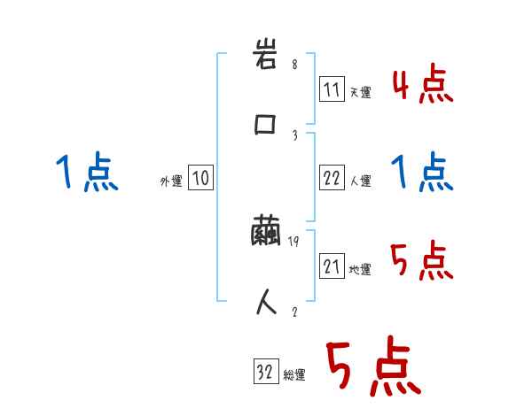 総運![]() | 岩口繭人さんの総運は32画の5つ星!柔軟性があり成功する。チャンスが多く金運が良い。 あなたの人生を表す1番重要な運勢です。生涯を通じて影響する総合運となり、主に50歳以降の晩年期に影響を及ぼします。 |