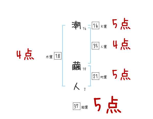 人運![]() | 潮繭人さんの人運は35画の4つ星!温厚な性格で感受性が高い。穏和な性格で人望が厚い。 性格や才能などを表す2番目に重要な運勢です。人間関係や協調性、社会的な成功に影響します。主に20歳から50歳ぐらいまでの中年期の運勢を表します。 |