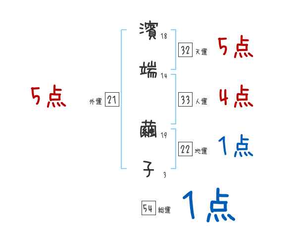 天運![]() | 濱端繭子さんの天運は32画の5つ星!柔軟性があり成功する。チャンスが多く金運が良い。 家系が持つ宿命的な運勢を表します。祖先から受け継いだ苗字ですので自分の力が及びません。家柄を象徴します。 |