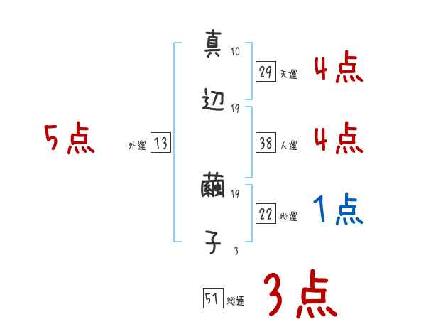 人運![]() | 真辺繭子さんの人運は38画の4つ星!温厚な性格で技術的な才能を発揮する。職人的な仕事に向いている。 性格や才能などを表す2番目に重要な運勢です。人間関係や協調性、社会的な成功に影響します。主に20歳から50歳ぐらいまでの中年期の運勢を表します。 |