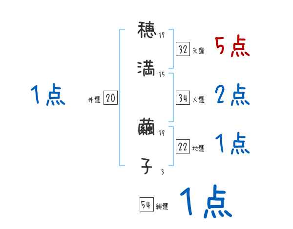 地運![]() | 穂満繭子さんの地運は22画の1つ星!努力することが苦手ないっぽう手先が器用。芸術性にも優れる。 個性を表す基礎的な運勢です。性格形成や対人関係、行動力など家庭環境に影響されます。主に誕生してから20歳くらいまでの若年期の運勢を表します。 |