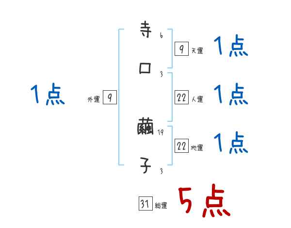 天運![]() | 寺口繭子さんの天運は9画の1つ星!消極的で才能を発揮することが苦手なことも。周りの意見に耳を傾けましょう。 家系が持つ宿命的な運勢を表します。祖先から受け継いだ苗字ですので自分の力が及びません。家柄を象徴します。 |