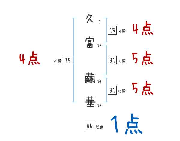 総運![]() | 久富繭華さんの総運は46画の1つ星!迷走することが多く苦労するかも。目先のことにとらわれないように。 あなたの人生を表す1番重要な運勢です。生涯を通じて影響する総合運となり、主に50歳以降の晩年期に影響を及ぼします。 |