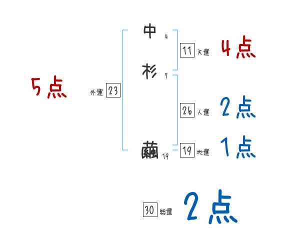 天運![]() | 中杉繭さんの天運は11画の4つ星!着実に富や地位を得る幸運な人生。 家系が持つ宿命的な運勢を表します。祖先から受け継いだ苗字ですので自分の力が及びません。家柄を象徴します。 |