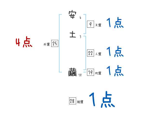 総運![]() | 安土繭さんの総運は28画の1つ星!家庭環境に注意。スポーツで活躍できる能力があるかも。 あなたの人生を表す1番重要な運勢です。生涯を通じて影響する総合運となり、主に50歳以降の晩年期に影響を及ぼします。 |