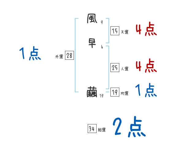 総運![]() | 風早繭さんの総運は34画の2つ星!独創性に優れるが、自尊心が強く災難に注意しましょう。 あなたの人生を表す1番重要な運勢です。生涯を通じて影響する総合運となり、主に50歳以降の晩年期に影響を及ぼします。 |