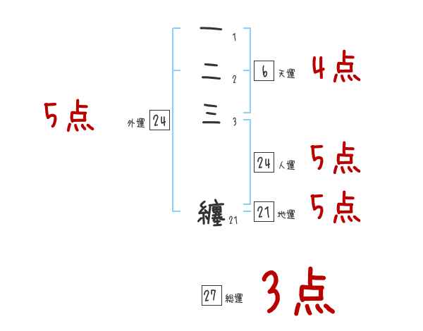 外運![]() | 一二三纏さんの外運は24画の5つ星!家庭運が良く順調な人生。金運にも恵まれる。 生活面を象徴する運勢です。外部から受ける影響力を表し、結婚運、家庭運や職場、環境への順応性を表します。 |