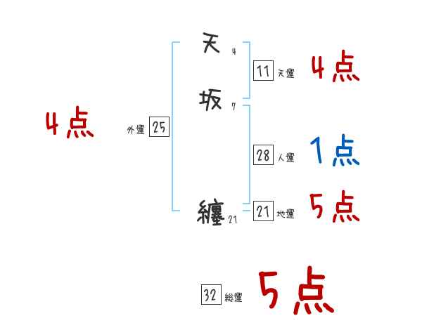 天運![]() | 天坂纏さんの天運は11画の4つ星!着実に富や地位を得る幸運な人生。 家系が持つ宿命的な運勢を表します。祖先から受け継いだ苗字ですので自分の力が及びません。家柄を象徴します。 |