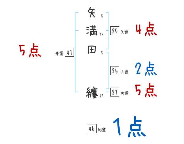 外運![]() | 矢満田纏さんの外運は41画の5つ星!大志を抱き、目標に向かって実力を発揮し達成する。温和な性格。 生活面を象徴する運勢です。外部から受ける影響力を表し、結婚運、家庭運や職場、環境への順応性を表します。 |