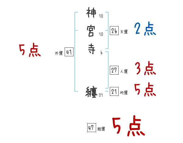 総運![]() | 神宮寺纏さんの総運は47画の5つ星!実力が開花し発展する円満な人生。財に恵まれる。 あなたの人生を表す1番重要な運勢です。生涯を通じて影響する総合運となり、主に50歳以降の晩年期に影響を及ぼします。 |