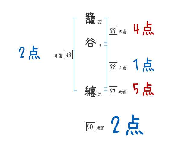 総運![]() | 籠谷纏さんの総運は50画の2つ星!浮き沈みが激しく不安定。しりすぼみに衰退しやすいので注意しましょう。 あなたの人生を表す1番重要な運勢です。生涯を通じて影響する総合運となり、主に50歳以降の晩年期に影響を及ぼします。 |