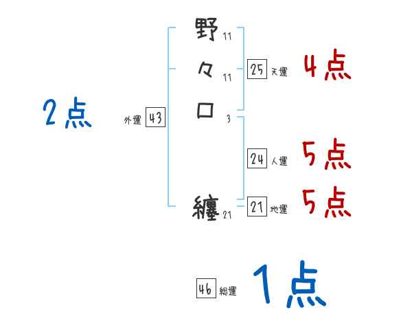 総運![]() | 野々口纏さんの総運は46画の1つ星!迷走することが多く苦労するかも。目先のことにとらわれないように。 あなたの人生を表す1番重要な運勢です。生涯を通じて影響する総合運となり、主に50歳以降の晩年期に影響を及ぼします。 |