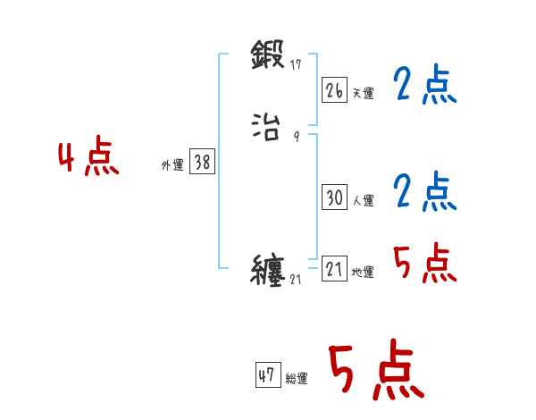 天運![]() | 鍛治纏さんの天運は26画の2つ星!波瀾万丈かも。信頼できる人を大事にしましょう。 家系が持つ宿命的な運勢を表します。祖先から受け継いだ苗字ですので自分の力が及びません。家柄を象徴します。 |