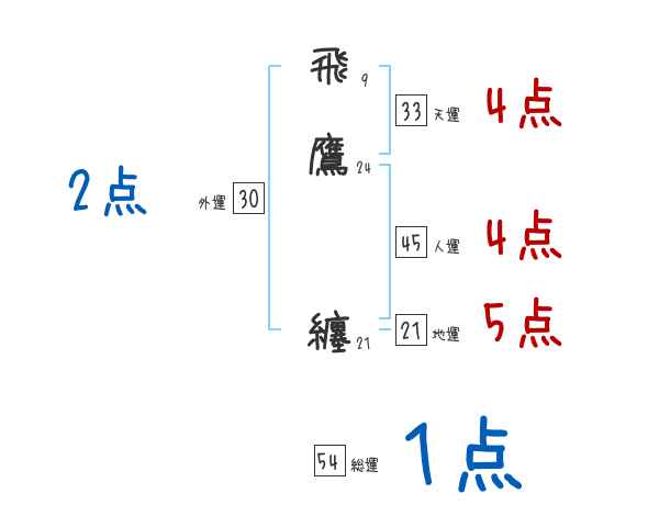 天運![]() | 飛鷹纏さんの天運は33画の4つ星!権力志向でプライドが高い。勇気があり運を切り開き成功する。 家系が持つ宿命的な運勢を表します。祖先から受け継いだ苗字ですので自分の力が及びません。家柄を象徴します。 |