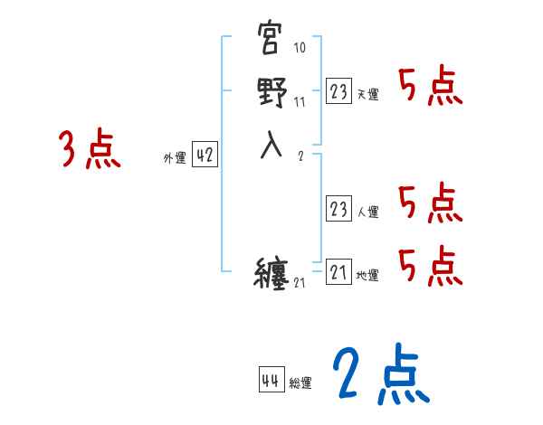 人運![]() | 宮野入纏さんの人運は23画の5つ星!想像力に優れ活力がある。一代で成功し名誉を手に入れる。 性格や才能などを表す2番目に重要な運勢です。人間関係や協調性、社会的な成功に影響します。主に20歳から50歳ぐらいまでの中年期の運勢を表します。 |
