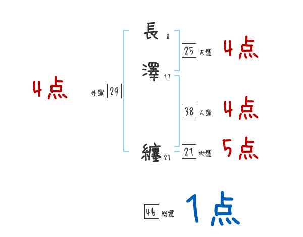 天運![]() | 長澤纏さんの天運は25画の4つ星!個性があり才能があふれる。強運の持ち主で発展する。 家系が持つ宿命的な運勢を表します。祖先から受け継いだ苗字ですので自分の力が及びません。家柄を象徴します。 |