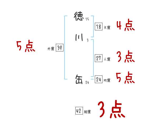 外運![]() | 徳川缶さんの外運は39画の5つ星!社交性に優れ人望が厚い。人の上に立ち成功する。 生活面を象徴する運勢です。外部から受ける影響力を表し、結婚運、家庭運や職場、環境への順応性を表します。 |