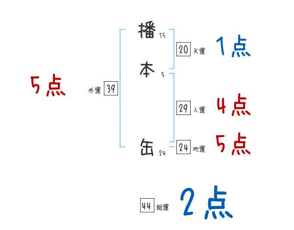 総運![]() | 播本缶さんの総運は44画の2つ星!誠実で慎重な性格。物事を考えすぎないように注意しましょう。 あなたの人生を表す1番重要な運勢です。生涯を通じて影響する総合運となり、主に50歳以降の晩年期に影響を及ぼします。 |