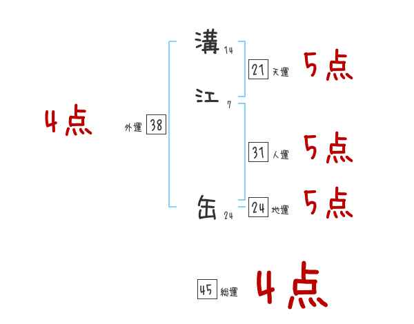 外運![]() | 溝江缶さんの外運は38画の4つ星!温厚な性格で技術的な才能を発揮する。職人的な仕事に向いている。 生活面を象徴する運勢です。外部から受ける影響力を表し、結婚運、家庭運や職場、環境への順応性を表します。 |