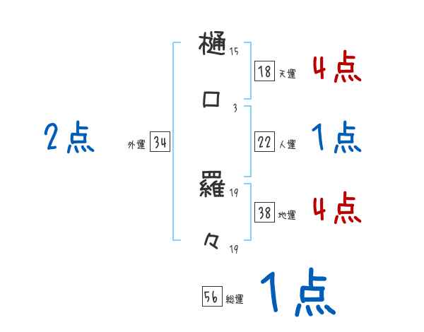 天運![]() | 樋口羅々さんの天運は18画の4つ星!情熱的で剛気。忍耐力があり信頼される。 家系が持つ宿命的な運勢を表します。祖先から受け継いだ苗字ですので自分の力が及びません。家柄を象徴します。 |