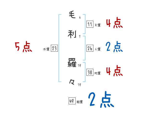 天運![]() | 毛利羅々さんの天運は11画の4つ星!着実に富や地位を得る幸運な人生。 家系が持つ宿命的な運勢を表します。祖先から受け継いだ苗字ですので自分の力が及びません。家柄を象徴します。 |