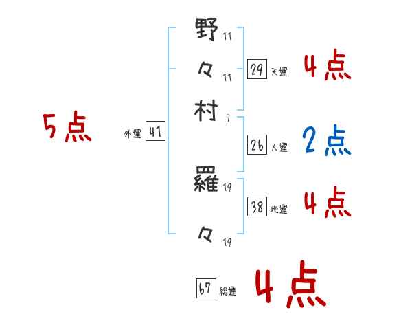 天運![]() | 野々村羅々さんの天運は29画の4つ星!完全主義で才能がある。厳格な心の持ち主。 家系が持つ宿命的な運勢を表します。祖先から受け継いだ苗字ですので自分の力が及びません。家柄を象徴します。 |