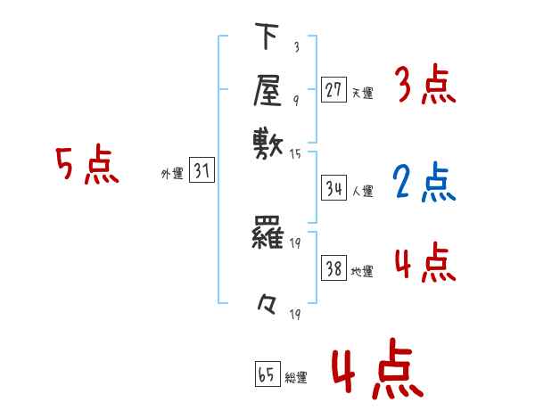 天運![]() | 下屋敷羅々さんの天運は27画の3つ星!頭脳明晰だが強情で摩擦が多い傾向。孤立に注意。 家系が持つ宿命的な運勢を表します。祖先から受け継いだ苗字ですので自分の力が及びません。家柄を象徴します。 |