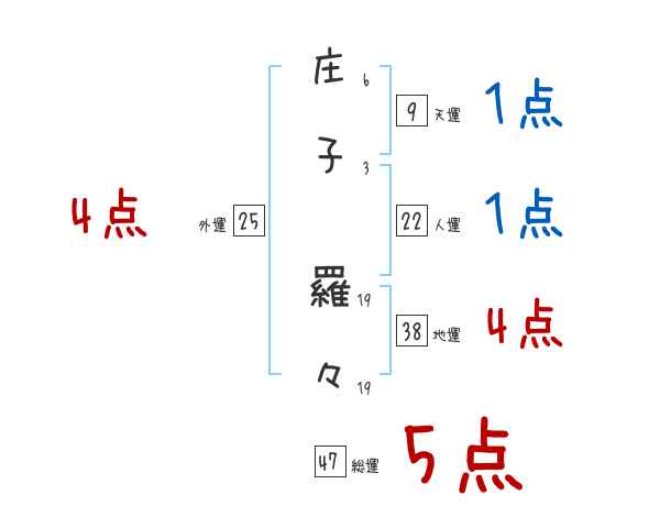 天運![]() | 庄子羅々さんの天運は9画の1つ星!消極的で才能を発揮することが苦手なことも。周りの意見に耳を傾けましょう。 家系が持つ宿命的な運勢を表します。祖先から受け継いだ苗字ですので自分の力が及びません。家柄を象徴します。 |