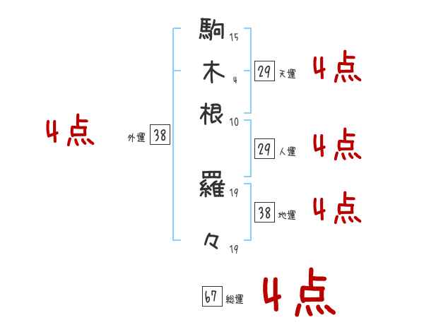 天運![]() | 駒木根羅々さんの天運は29画の4つ星!完全主義で才能がある。厳格な心の持ち主。 家系が持つ宿命的な運勢を表します。祖先から受け継いだ苗字ですので自分の力が及びません。家柄を象徴します。 |